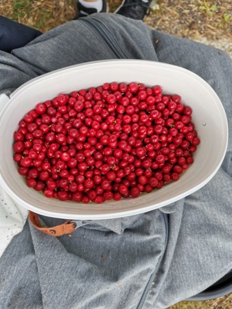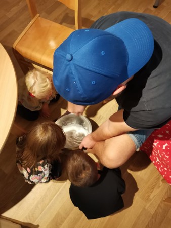 Vi har skogsområde rett utenfor barnehagen vår, der er det både tyttebær- og blåbærlyng. Det er noe eget ved å sitte ved bærtua og putte modne bær rett i munnen. Da vi kom tilbake til barnehagen lagde vi trollkrem, det smakte interessant og litt godt syntes barna.